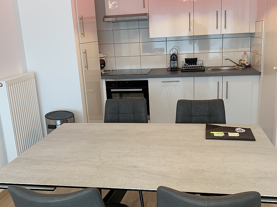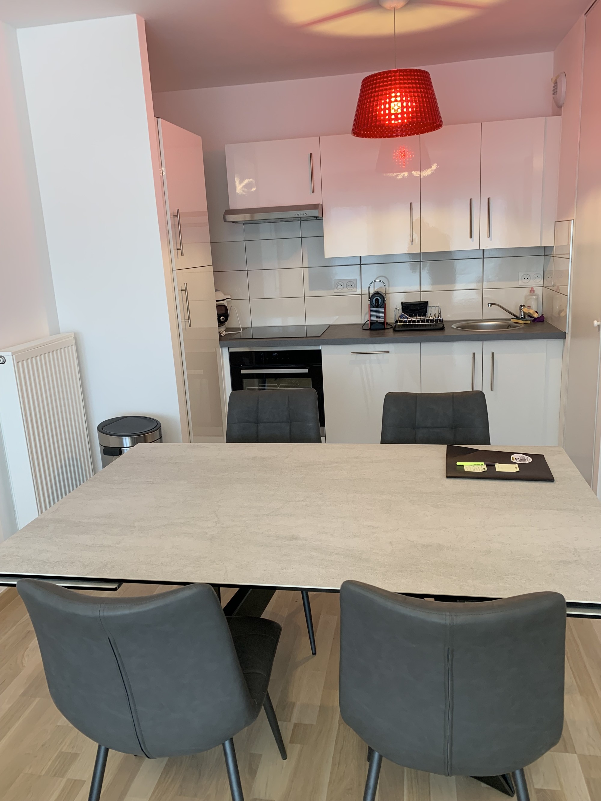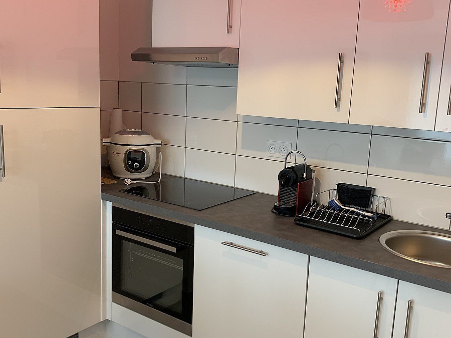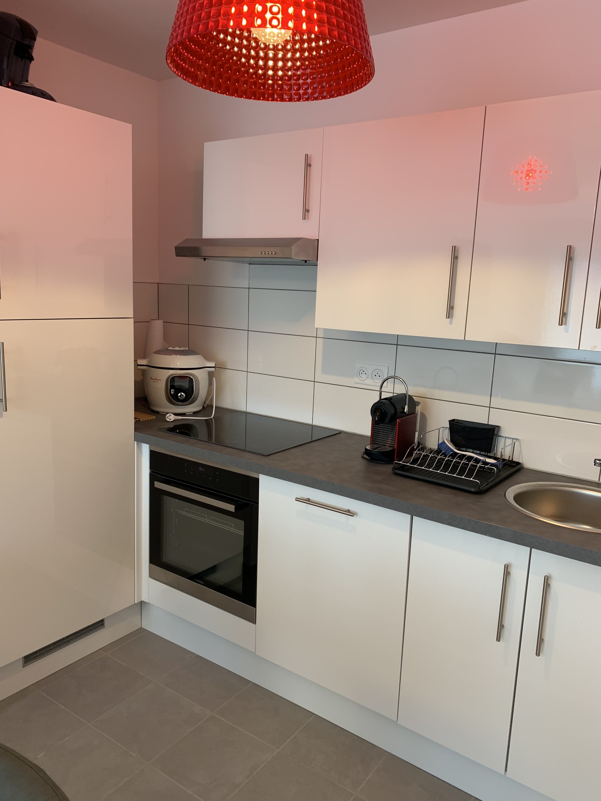 - une cuisine ouverte sur le salon / salle à manger équipée avec lave vaisselle, lave linge, micro ondes, four, réfrigérateur, plaques vitro, cafetière Nespresso, grille pain, Cookeo, bouilloire.