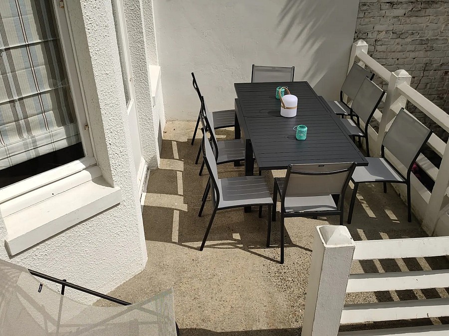 La maison est composée d'une salle à manger, d'une cuisine équipée et d'un salon donnant sur une terrasse.