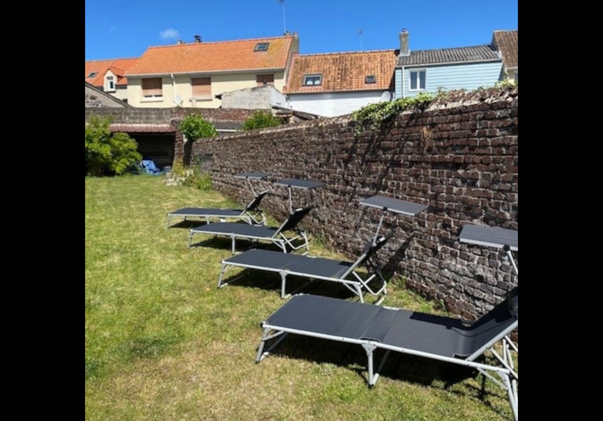 Jardin clos ensoleillé avec transats, patio avec table et chaises pour prendre ses repas dehors, barbecue.