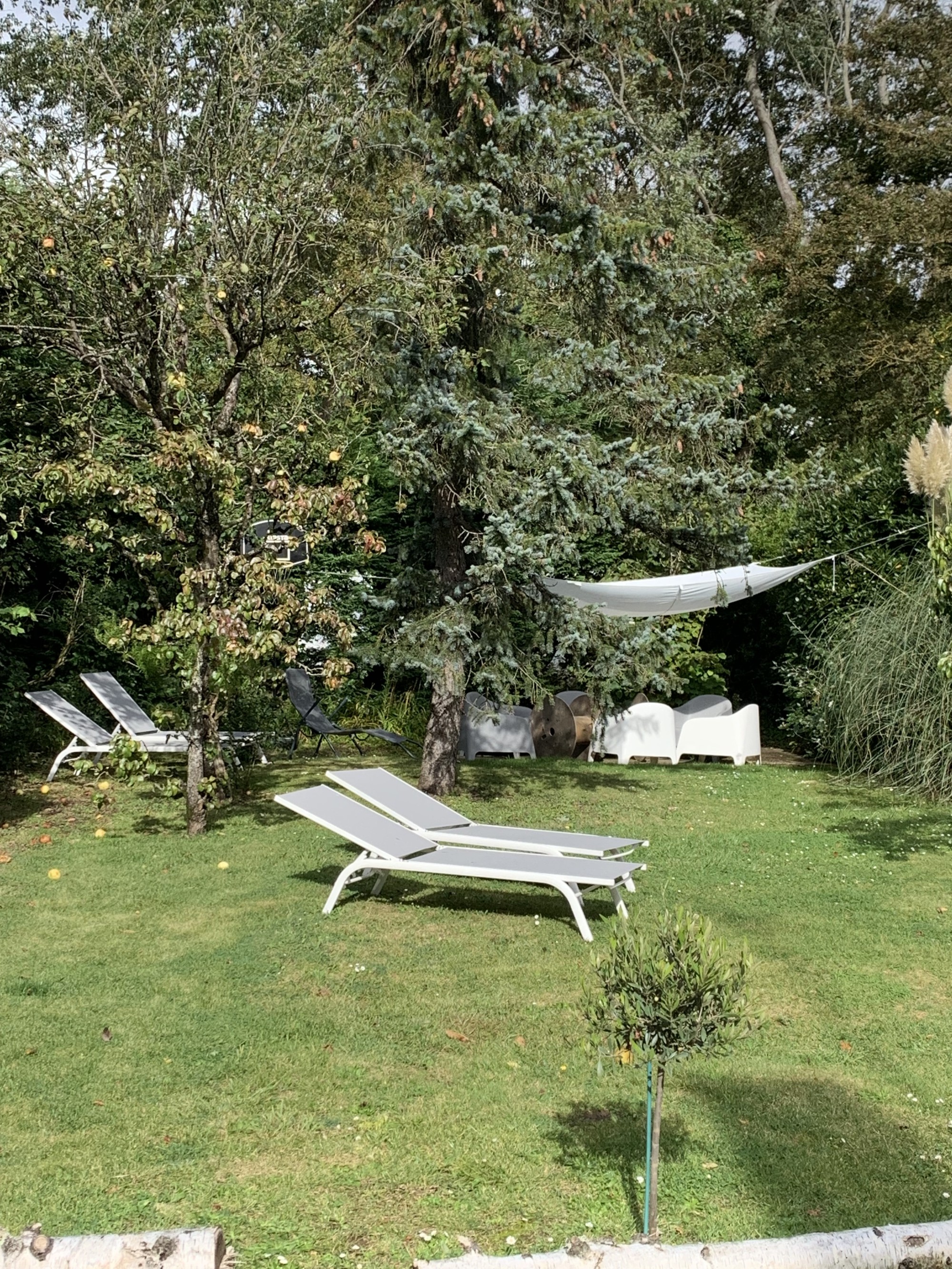 2 grands jardin avec mobilier extérieur et barbecue charbon