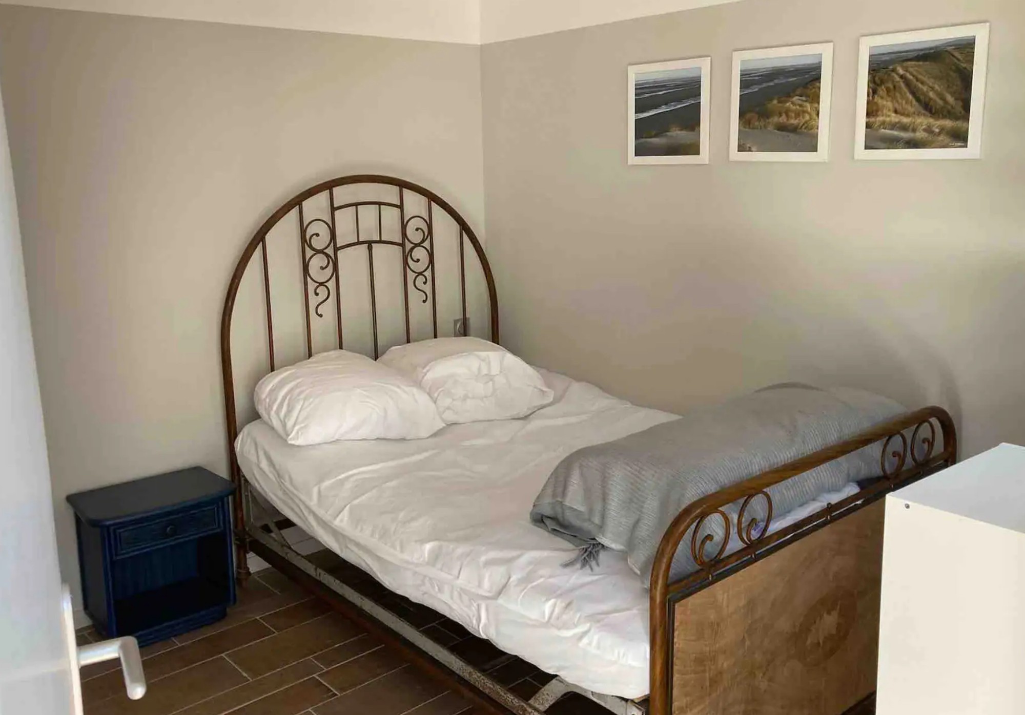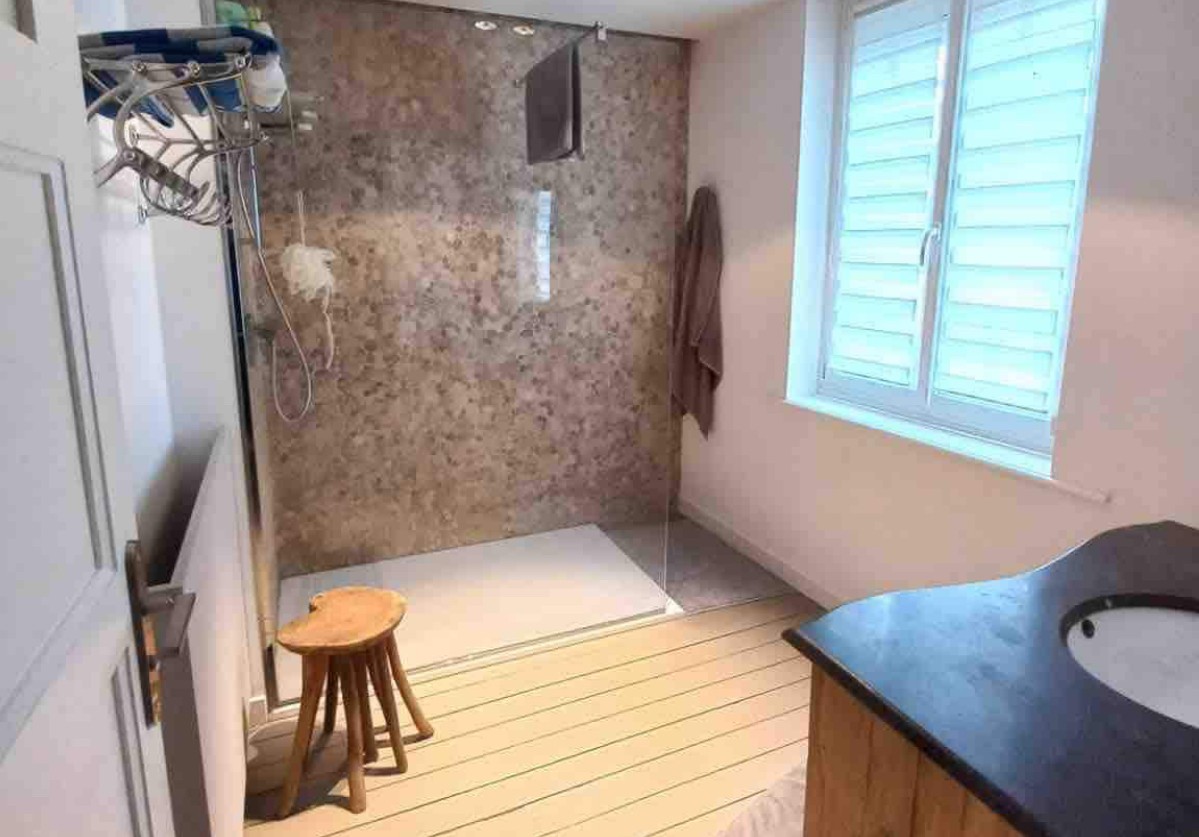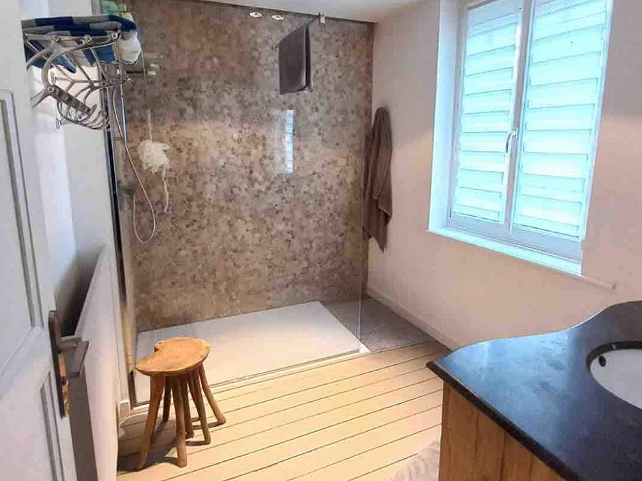 Composée d’un grand salon, séjour et d’une cuisine ouverte au rez de chaussée, la maison dispose de 3 chambres avec lit double et une salle de bain avec douche à l’étage.