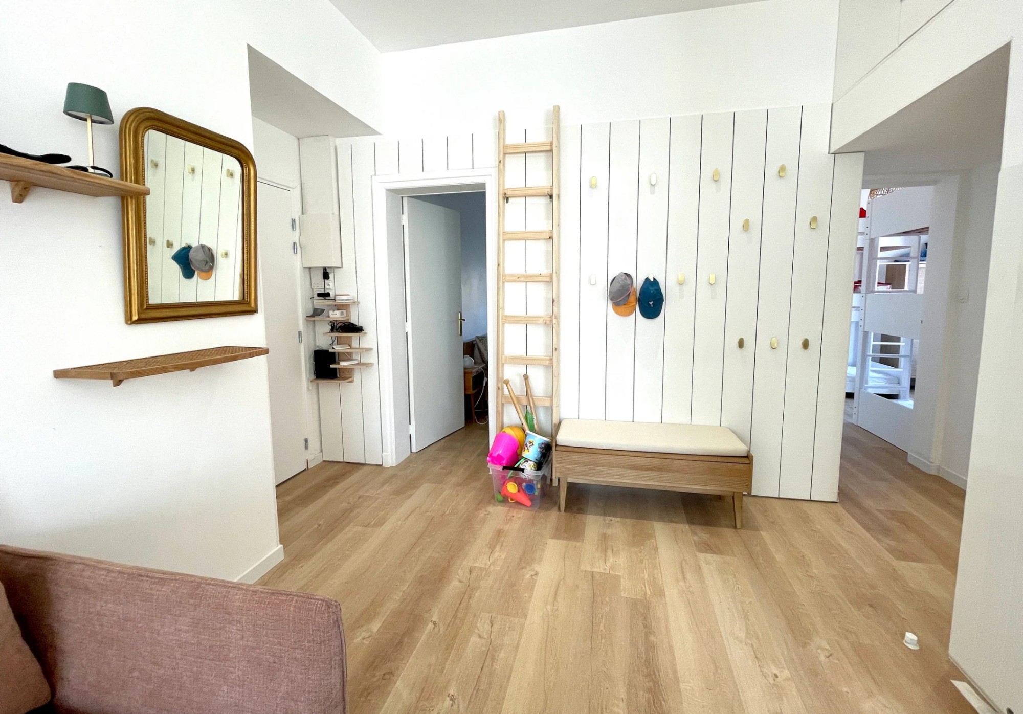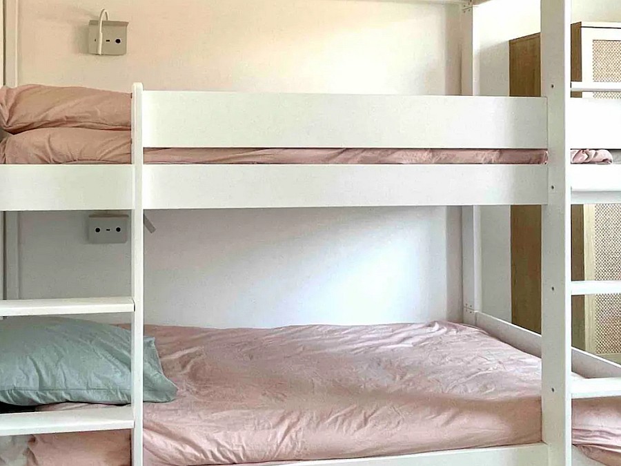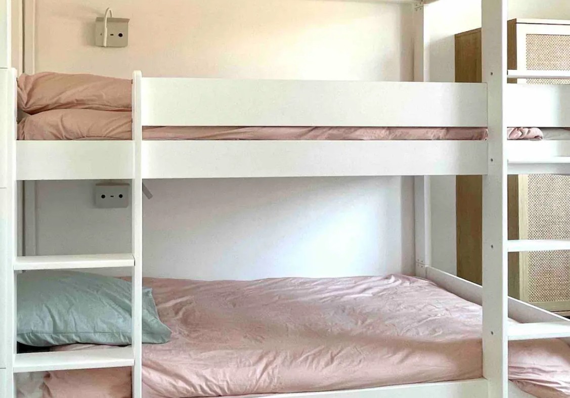 - une avec 2 lits superposés 90x200 adaptés aux enfants & aux adultes ainsi qu’une armoire