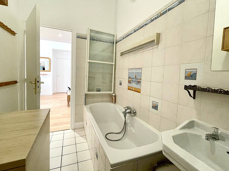 🛁 La salle de bain est avec baignoire et pare douche, WC, vasque, machine à laver séchante (qui fait aussi table à langer!). Également un séchoir à linge au dessus de la baignoire pratique pour faire sécher les maillots de bains.🛁
