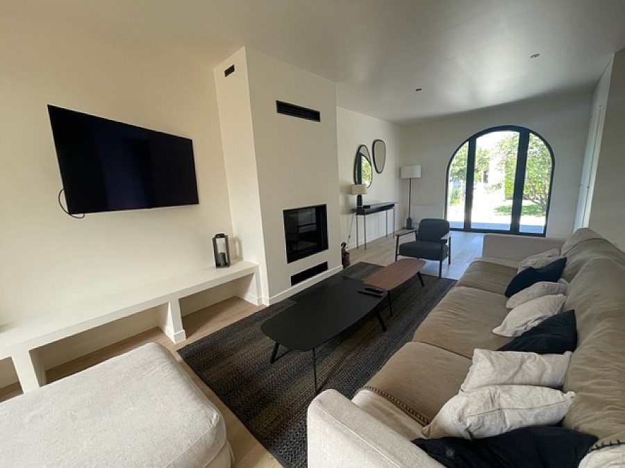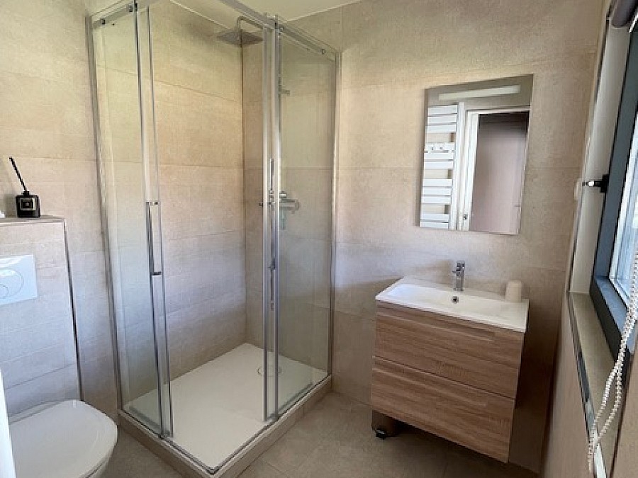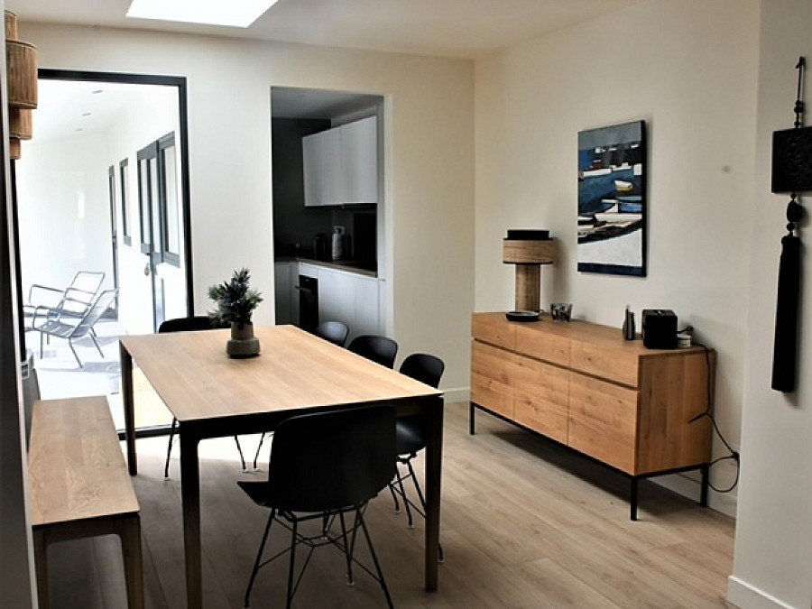 La maison dispose d’un grand séjour avec cheminée à insert et d’une TV écran plat et d’une cuisine toute équipée ouverte sur le jardin ; de 3 chambres avec chacune leur salle de bain privative (dont une avec baignoire) ainsi qu’une annexe avec 2 chambres et une salle de bain donnant sur le jardin.
