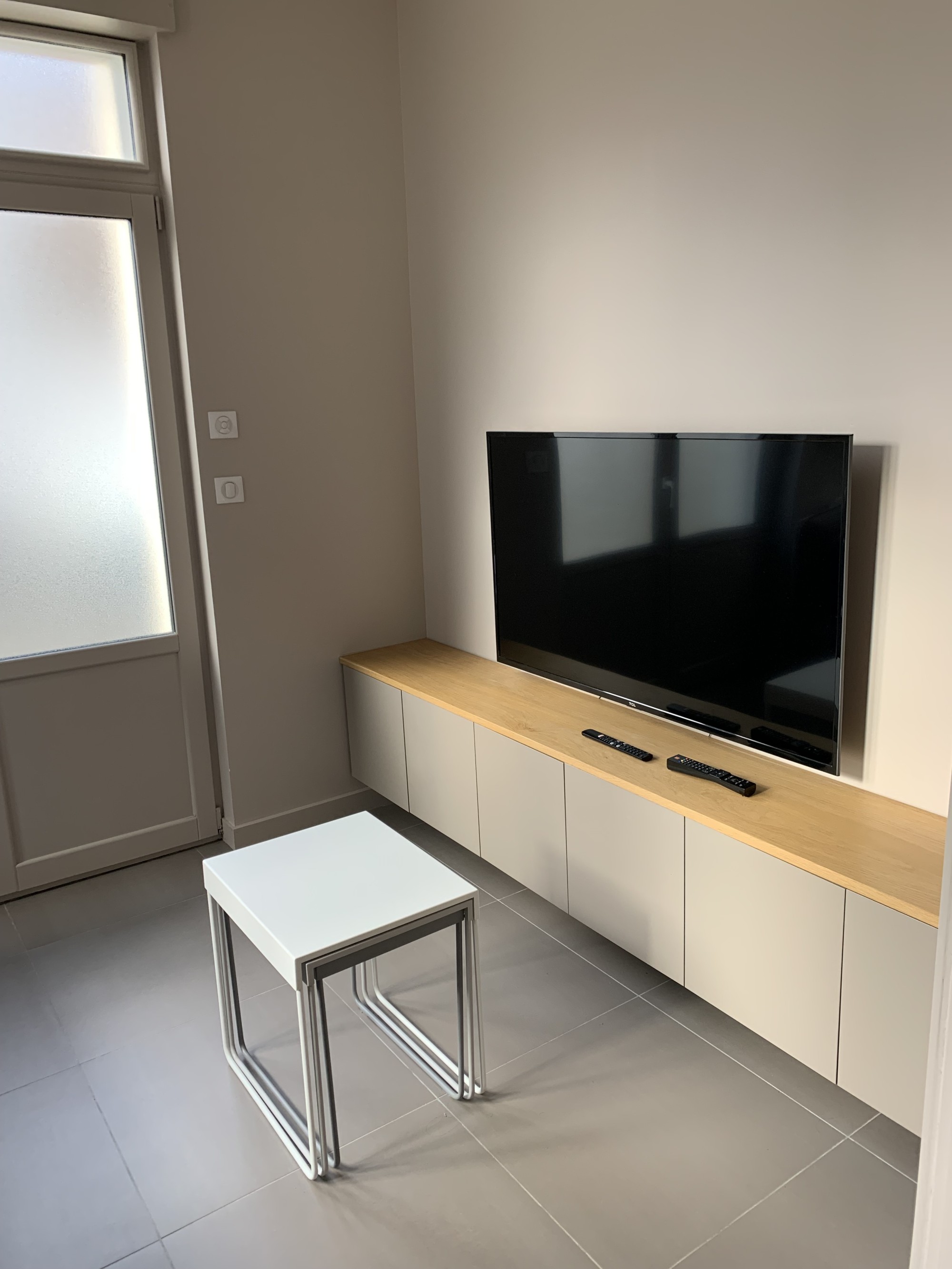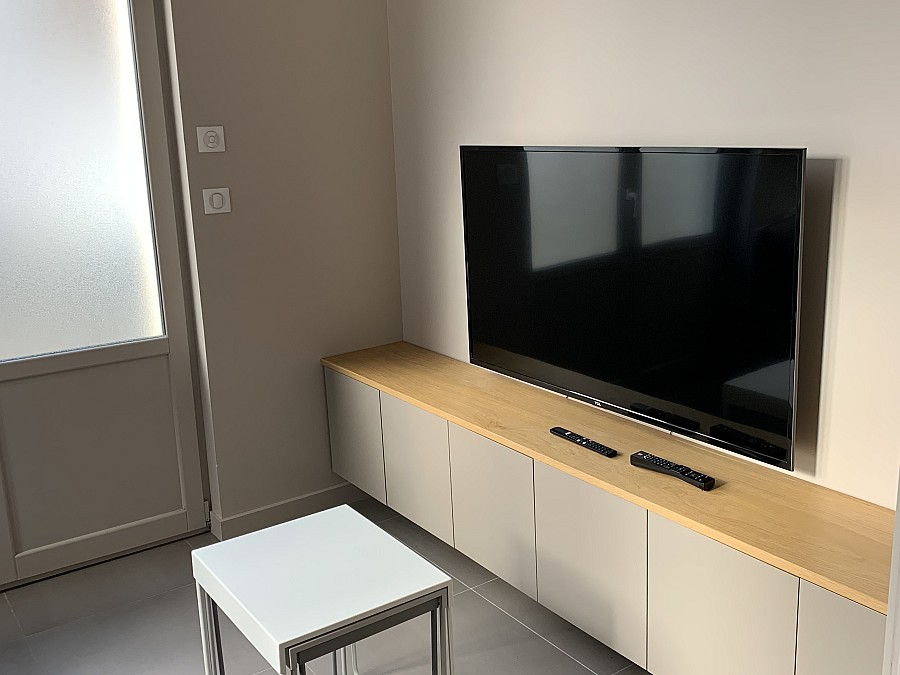 Salon: Netflix sur grand écran, internet, 2 espaces de travail connectés.